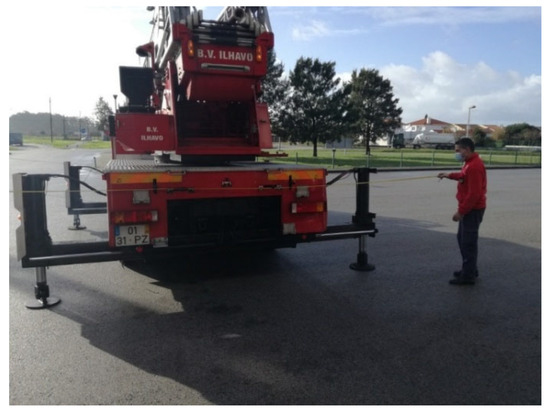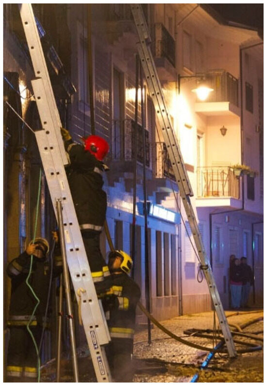 Poorly parked vehicles, construction work, and other specific obstacles often make it necessary for firefighters to enter the affected zone in the opposite direction to provide assistance (Figure 17). In these places, ladder vehicles also have difficulty manoeuvring. In addition to having difficulty moving around the area due to their size, these vehicles also need extra space to stabilise and manoeuvre, as mentioned earlier, which prevents their use given the width of the streets and the existence of parking on public roads. Therefore, support for operations, whether in fighting fires or rescuing people, must be provided using manual ladders (Figure 18).