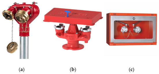 This buried dry pipework can be implemented simply and at a relatively low cost, with accessories that are currently used in other indoor and outdoor firefighting systems. An inlet similar to that used in dry risers in buildings (Figure 19a) in a location accessible to firefighters’ vehicles, a buried pipe (diameter 80 m or 100 mm), and outlets near the most critical locations, which can be buried (Figure 19b) or placed in a fixed cabinet on exterior walls (Figure 19c), will be sufficient. Based on current prices in Portugal, the estimated cost of a dry pipework approximately 200 m long with these characteristics is EUR 16,000, a value that can easily be justified in many situations considering the degree of risk in the area and the costs associated with a possible urban fire.