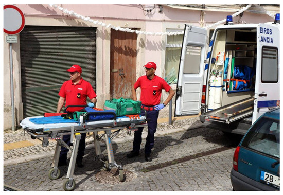 Another limitation to firefighters’ work, linked to parking vehicles on the streets, is related to health, including pre-hospital assistance and the transport of non-urgent patients (Figure 21). To assist the population in these locations, it is necessary to leave the emergency vehicle or transport vehicle on the main street and then travel through smaller streets and alleys, carrying the stretcher and all the materials necessary for rescue and transport. It is also important to mention that the vehicle must remain stopped on the main road, momentarily preventing circulation, as there is no stopping place for these vehicles (Figure 22).