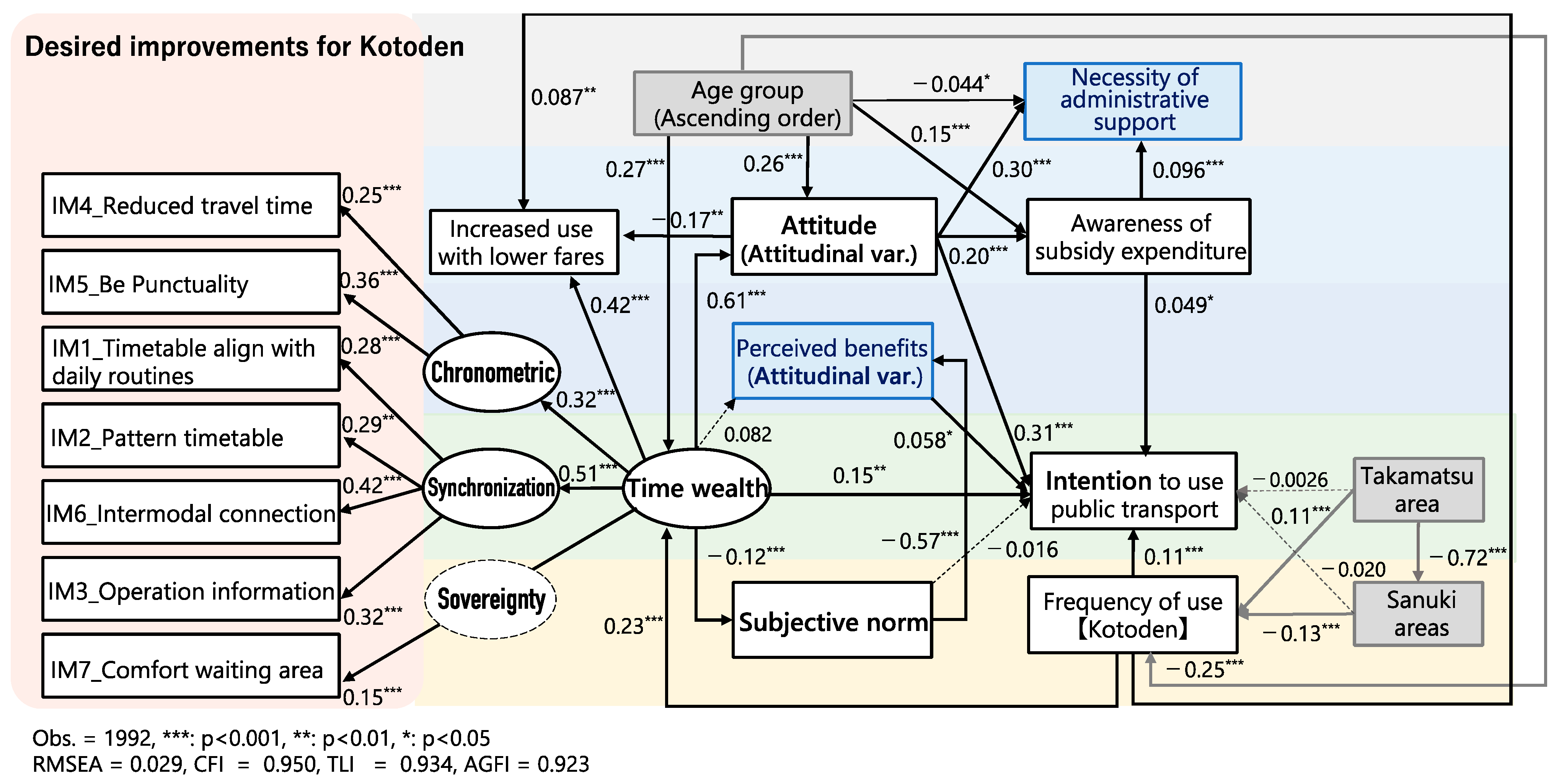 Figure 8 (right) compares the effects of the core Theory of Planned Behavior (TPB) factors—attitudinal variables, subjective norm, and PBC (i.e., time wealth in this study)—on intention. Attitudinal variables exert the greatest influence on intention, followed by time wealth and subjective norm. Additionally, geographical factors, including the Takamatsu and Sanuki areas, have positive direct effects on intention relative to the reference area of Shodoshima.