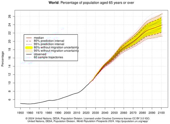 - Department of Economic and Social Affairs, United Nations. Population Division. World Population Prospects 2024. 2024. Available online: https://population.un.org/wpp/graphs?loc=900&type=Probabilistic%20Projections&category=Pop%20Percentages&subcategory=Age%2065%20and%20over (accessed on 10 May 2025).