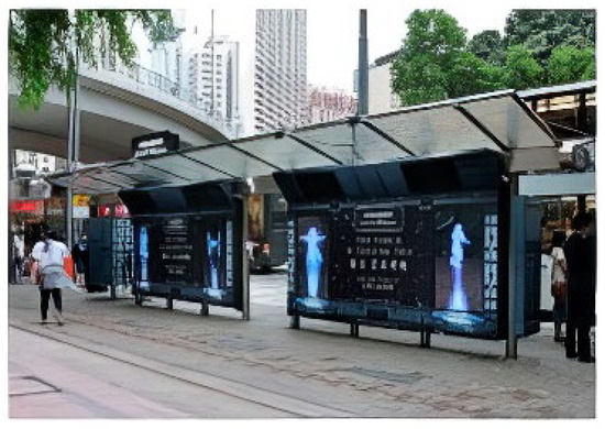 Several European and Asian cities have launched smart bus stop pilot projects. The interfaces of the smart bus stops are increasing in technical sophistication. Figure 3 shows the use of directional sound and big screens for publicity campaigns [38].