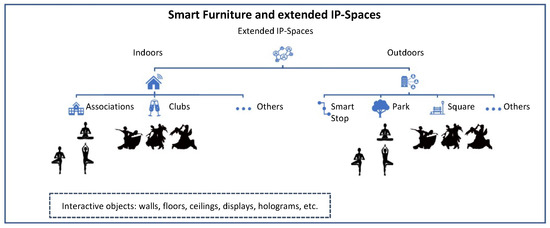 The extended IP-Space (EIPS) concept includes outdoor and indoor public implementation of the IP-Spaces (Figure 4). It reduces the requirements for electronic system capability to withstand harsh environmental conditions (reduced costs) while keeping the requirements of being outside the home and sharing collective experiences. This allows the use of existing locations such as clubs, elder people associations, etc.