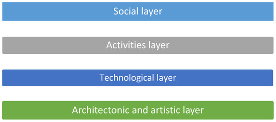 The layered design of HERMÓPOLIS platform (up–down): social, activities, technological and architectonic–artistic layers.