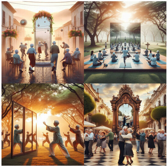 The images were generated using the Copilot Designer tool with technology DALL-E.3. To generate the images, prompts should include words representing the relevant aspects of the scene. For example, “park trees sunset elderly females and males practicing Taichi mirrors” or “square in a town afternoon elderly females and males dancing tango around one big vertical mirror in the middle of the square”.
