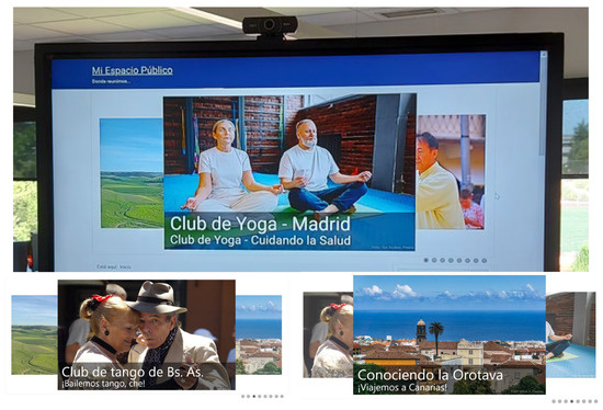 In the early stages of development, the focus was on deploying a minimal yet functional technological infrastructure. This approach was essential for starting with a small-scale implementation that could then be scaled up as the platform matured. The first implementation involved the installation of wide-angle cameras, 40-inch monitors, infrared frames and laptops, which were used as physical access points. The initial setup was complemented by the creation of a simple landing page (https://miespaciopublico.es/index.php), which provided an entry point for elderly users to access virtual meeting rooms where activities took place. This web-based interface was designed to be extremely simple and user-friendly, allowing users with varying degrees of technological proficiency to easily navigate the platform. The decision to start with a basic website was strategic, as it enabled the research team to conduct early-stage experiments and gather user feedback on the platform’s usability. As the platform evolves, this website will serve as the foundation for future developments, such as integrating more advanced features like real-time analytics, personalized activity recommendations and enhanced accessibility options for individuals with disabilities (Figure 8).