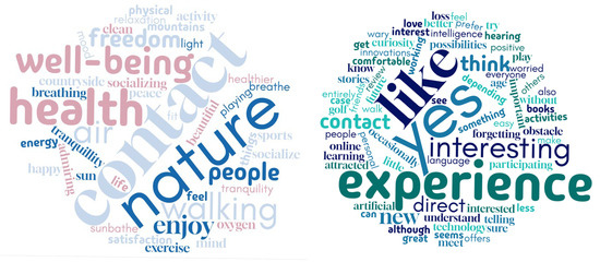 The relevance of outdoor activities for the elderly’s physical and mental health is exposed in [32,33,34,35,36]. These studies identify the barriers that the elderly find for the realization of outdoor activities such as physical barriers, the lack of motivation or confidence, the fear of falling and the absence of social support (and the relation of the latter with the motivation) [33]. The Urban Health Path project [32] includes an innovative form of the physical and cognitive activation of the elderly, where the architectural elements, such as details, façade features and urban furniture, inspire movement and attentiveness in the experience of space. The concept is supported by a mobile application specially designed for the users employing the Design Thinking method. The benefits of biophilic design (blending natural elements into built environments to improve our connection with nature) to enhance the psychological well-being and quality of life of baby boomers dwelling in assisted living facilities are exposed in [34].