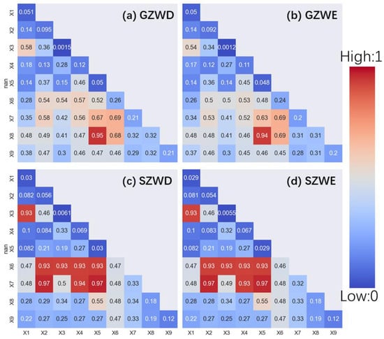 | X6 | 0.261 | 0.000 | 0.237 | 0.000 | 0.465 | 0.000 | 0.462 | 0.000 | 0.357 | 1 |