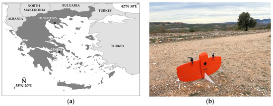 (a) The locations of the archaeological site of the Olynthus in Greece and (b) the UAS WingtraOne GEN II in the archaeological site of the Olynthus.