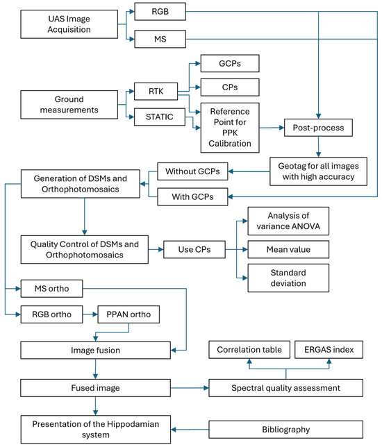 The methodology of the study includes six main stages (Figure 2). The first stage is the acquisition of RGB and MS images using UAS over the archaeological site of Olynthus. The second stage is the collection of ground measurements of GCPs and CPs with a GNSS receiver. Field measurements with the same receiver also include measuring the reference point for PPK calibration. The third stage involves processing the images to generate DSMs and orthophotomosaics. The fourth stage is the evaluation of the resulting DSMs and orthophotomosaics (calculating the mean, standard deviation, RMSE, and performing an analysis of variance or ANOVA) by comparing the field-measured coordinates of the CPs with those derived from the products. The fifth stage is the creation of a pseudo-panchromatic (PPAN) image from the RGB images and an image fusion using the PPAN and MS imagery. This is accompanied by an assessment of the fused image’s spectral quality through calculation and evaluation of the correlation table of bands and the ERGAS index. The sixth and final stage is the use of the fused image and the relevant bibliography to present the Hippodamian system of ancient Olynthus.