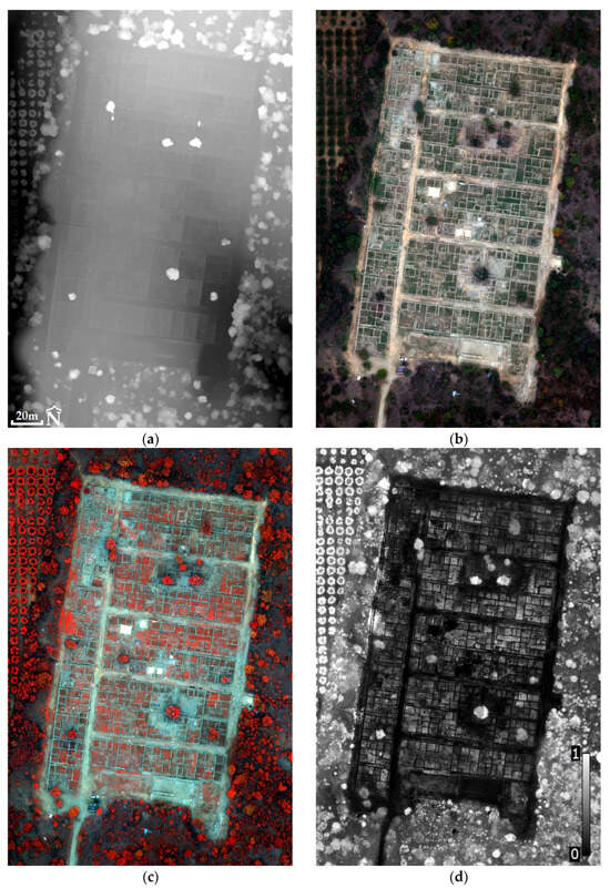 The excavated area of ancient Olynthus with the Hippodamian system (center of images: 40°17′47.52″ N 23°21′15.37″ E); without (for example) the use of GCPs in the processing of MS images: (a) DSM (altitudes: from black color, 38 m, to white color 70 m); (b) MS orthophotomosaic (bands: blue, green, and red); (c) MS orthophotomosaic (bands: blue, green, and NIR); (d) NDVI index (value of 0 corresponds to pixels without crop, and value of 1 corresponds to pixels with good growth or healthy crop).