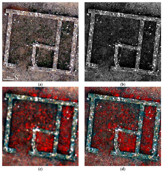 In the case of UAS, the thematic information (completeness, resolution, and overall quality of the objects) of the images varies depending on the sensor used. An RGB sensor will capture objects in the visible spectrum with a spatial resolution of a few millimeters from a low flight altitude, whereas a multispectral (MS) sensor, operating from the same altitude, captures objects in spectral bands beyond the visible with a spatial resolution of a few centimeters. For example, the UAS Phantom 4 collects RGB images (using its 1/2.3” CMOS 12.4 Mp RGB sensor) at an approximate spatial resolution of 1.5 cm from a flight height of 40 m, while it gathers MS images (using the Sequoia+ MS sensor by Parrot 1.2 Mp (Parrot SA, Paris, France), covering green, red, Red Edge, and near infrared (NIR) bands) at about 4 cm resolution from the same height [5]. The UAS Wingtra GEN II (Wingtra AG, Zurich, Switzerland) collects RGB images (using the Sony RX1R II 42.4 Mp RGB sensor, Sony Group Corporation, Tokyo, Japan) with a spatial resolution of 1.5 cm from a flight height of 100 m, and from that same height, it acquires MS images (using the MicaSense RedEdge-MX 1.2 Mp MS sensor, covering blue, green, red, Red Edge, and NIR, MicaSense Inc., Seattle, United States) at a resolution of approximately 7 cm [6]. Thus, while the spatial resolution of the thematic information in RGB images is excellent, the corresponding resolution of MS images is not acceptable for archaeologists when they require orthophotomosaics at scales of 1:50 or 1:100.
