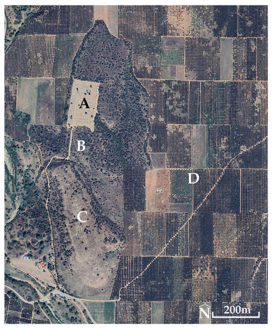 The ancient city of Olynthus extended from the southern hill (position C, Figure 7) which was the initial site of the settlement, to the northern hill (position A, Figure 7), where the settlement expanded, and to the area of the villas (position D, Figure 7) which later became the eastern suburb of the settlement [49].