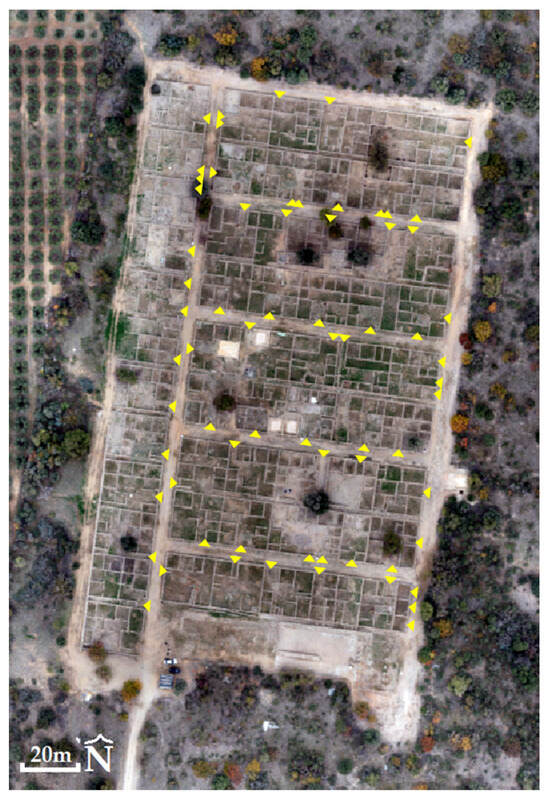 In this study, the UAS Wingtra GEN II (Wingtra AG, Zurich, Switzerland) was used to collect RGB and MS images of the Hippodamian system of ancient Olynthus (Central Macedonia, Greece, Figure 1). Ground Control Points (GCPs) were measured in the field using GNSS to solve the blocks of images and produce Digital Surface Models (DSMs) and orthophotomosaics. Corresponding products were also generated using the UAS’s Post-processed Kinematic (PPK) system (without the use of GCPs). Check Points (CPs) were measured in the field for quantitative control of products, which is the first objective of the study (to assess the horizontal and vertical accuracy of the products). The primary methods for evaluating a product include calculating the mean, standard deviation, and Root Mean Square Error (RMSE) [8,9,10,11]. Additionally, when the data follow a normal distribution, analysis of variance (ANOVA) is used for hypothesis testing. This process helps identify differences in mean values and standard deviations across various datasets, such as the measurements on the products versus those taken in the field [6].