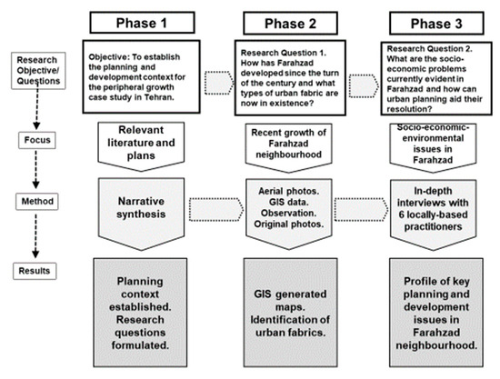 This research is based on an interpretivist philosophy and an inductive, qualitative approach. This is in line with Gill and Johnson’s [31] assertion that an inductive approach is best suited to research in which the aim is to explore a study area and develop an explanation of the phenomenon being studied. There were three main phases in the research process (Figure 3). Firstly, a narrative synthesis was undertaken to identify key concepts and develop the research questions for the study, reported above in Section 1. A narrative synthesis can look at multiple sources and provide a summary overview of the subject matter. It can involve a “broad scan of contextual literature” through which “topical relationships, research trends, and complementary capabilities can be discovered” [32] (p. 351). Various academic databases, including Science Direct, IEEE Xplore, and Google Scholar, were used to search for relevant sources, and the master plan for Tehran and associated documents were assessed.