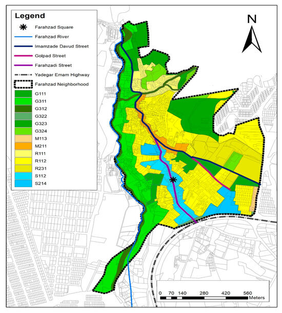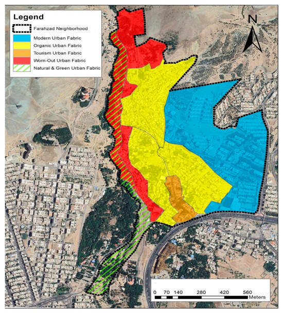 The urban fabric of an area can be conceptualised as its physical characteristics, including the streetscapes, buildings, landscaping, roads and other infrastructure. Lynch [22] took “fabric”, “density”, and “accessibility” as the main characteristics to define urban space, and argued that fabric was an effective tool for reflecting overall morphological characteristics, asserting that fineness and degree of uniformity were important aspects of urban fabric. However, Li et al. [23] argued that urban fabric not only reflects the physical characteristics of environmental structure, but also embodies social and economic relationships, and that the nature of land use, land value, construction intensity, and spatial density can also be considered in urban fabric studies. Thomson and Newman [24] further suggest that some urban fabrics have inherently more sustainable properties that need to be optimised and extended to other parts of an urban area. So, several different types of urban fabric can be identified, with WoUFs, discussed above, being just one type of urban fabric. Here, the evolution of the urban fabric in Farahzad is studied, taking its broader definition to include environmental and social aspects [25], as well as physical structure.