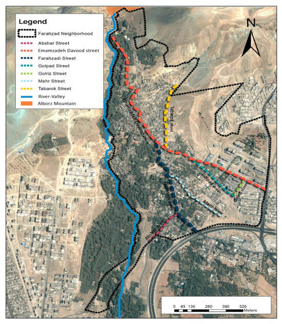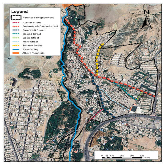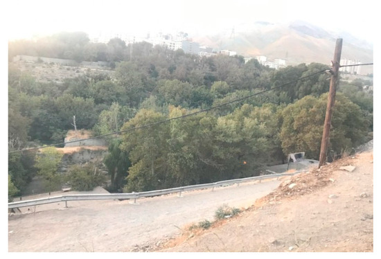 In contrast, the urban environment in the eastern part of Farahzad is of a higher quality, with better access to the city centre, and newer and better-quality housing with relatively affluent inhabitants [38]. This is adjacent to the main area of business and commercial activity which has grown up around Emamzadeh Davood street and the Yadegar-e Emam Expressway, which curves around the southern border of the neighbourhood, leading eastwards. The residential areas cover most of the central part of the neighbourhood, with green zones in the periphery to the north and west.