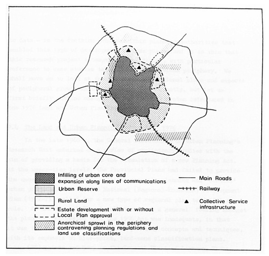 de Teran’s model of urban growth (originally applied to development in Spanish urban areas in the period 1956–1978). Based on de Teran [43].
