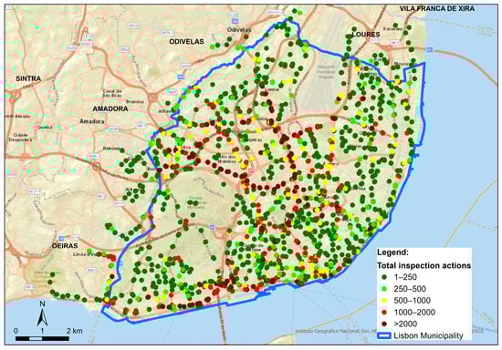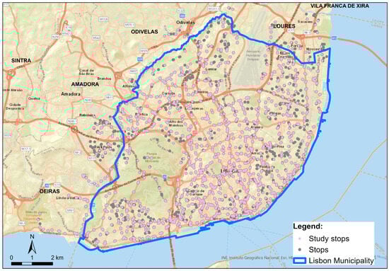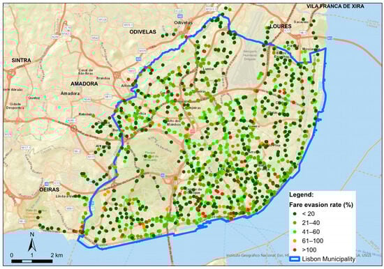 Carris [34] provides public road passenger transport services in the Lisbon Metropolitan Area. In 2019, there were 87 routes on offer, with an average length of 19 km (round trip) and 2221 stops, including 1992 (90%) located in the municipality of Lisbon (see Figure 1). In this work, particular emphasis will be placed on stops where at least one inspection action occurred, which corresponds to a total of 1654 stops. Inspection actions involve stopping the bus for checks (in a stop or on-route to the next stop), so each action is tagged to a particular bus stop. The evasion rates oscillated between 2.2% and 12.5% of detected evasions per inspection action, depending on the period of the day and whether it was a working day or weekend. The evasion rate also varied during the year, but this dependence was not studied beyond descriptive statistics because year-to-year comparisons would require data spanning multiple years, which was not available.