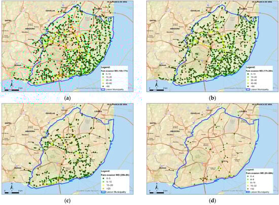 Spatial distribution of detected evasion for periods with endogeneity. (a) Detected evasion, weekdays 10–17 h. (b) Detected evasion, weekdays 17–20 h. (c) Detected evasion, weekdays 20–0 h. (d) Detected evasion, weekends 0–6 h.