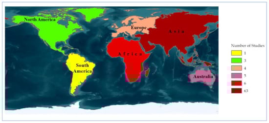 Based on Figure 2 results, the year-wise distribution of the conducted research revealed a significant increase in relevant studies from 2017 onwards, with a sharp rise in publications during the past three years (2021–2023). Notably, 61 (75.3%) of the 81 studies were published during this period, highlighting a growing interest and awareness of the escalating impact of LULC on LST. Figure 3 depicts the geographical distribution of the selected studies across continents, showing that a substantial proportion of the research was conducted in Asia, with a particular focus on countries such as Bangladesh and India.