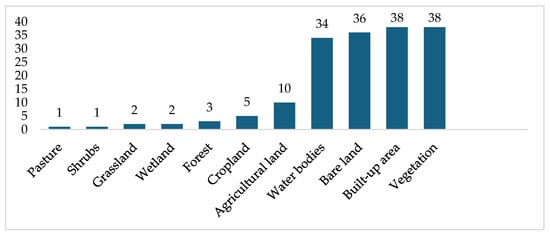 In the analysis of LULC classes across the reviewed studies, as depicted in Figure 6, distinct patterns emerge, highlighting the dominance of specific categories in LULC classification efforts. The built-up and vegetation area takes precedence, featured in 38 studies, reflecting a significant emphasis on urban development and infrastructure changes and anticipating changes in natural ecosystems. Bare land is considered in 36 studies, indicating a concerted effort to understand the dynamics of open spaces and land devoid of vegetation. Water bodies rank as the third most frequently employed category, appearing in 34 studies, emphasizing the attention given to aquatic environments and associated transformations. This thorough examination of several LULC classes highlights the complex character of land-use studies by capturing the unique characteristics of both natural and man-made changes in various types of landscapes.