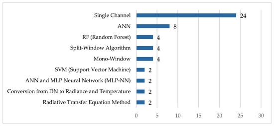 Single-channel methods are widely used to derive LST values (Figure 7), as evidenced by the 24 studies that employed them. These methods are favored for their simplicity and computational efficiency, offering a straightforward approach that minimizes complexity while yielding reliable temperature estimations. Their emphasis on utilizing information from a single channel simplifies the estimation process, making them an attractive choice when computational resources are limited or when a simple, yet effective solution is required.