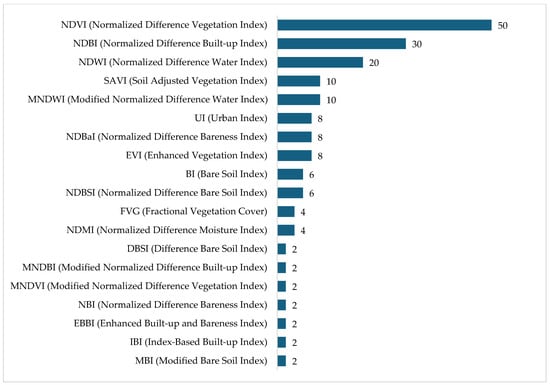 Among the various indices analyzed (Figure 8), NDVI in 50 studies and NDBI in 30 studies were the most employed, underscoring their importance in vegetation and urban land assessment, respectively. The high use of NDVI highlights the continued reliance on vegetation indices to monitor ecosystem health, detect deforestation, and assess urban expansion’s effects on green spaces. In contrast, NDBI’s extensive application reflects the increasing focus on built-up area detection, which is needed for understanding the rate and patterns of urbanization.