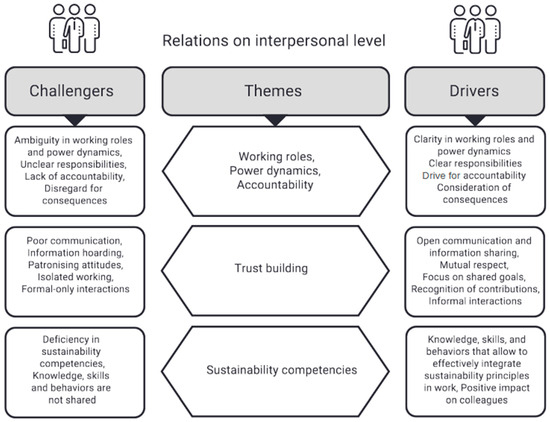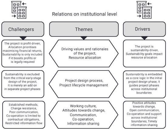 The analysis of the results showed that promoting sustainable, carbon-smart solutions in a residential construction project is a highly complex phenomenon, with factors both driving and challenging it. The determinant findings are categorised at both an interpersonal level (Figure 1) and an institutional level (Figure 2). This two-level decomposition of dynamic relations aims to provide a deeper understanding of the complex nature of ties that impact carbon-smart work. The question is not just about individual competence or organisational practices; it is their interplay. The challengers and drivers do not emerge solely from professionals’ interactions but also from interacting institutional principles, processes and working cultures. The categorisation may also help to reflect where problems truly originate and where interventions will be the most effective. Many of the drivers and challengers of carbon-smart solutions at the interpersonal level were related to themes of UGI professionals’ working roles, power dynamics, and professional accountability. There were also notable findings in themes related to professionals’ experiences in building trust through open communication, collaboration, and information sharing, as well as their sustainability competencies.