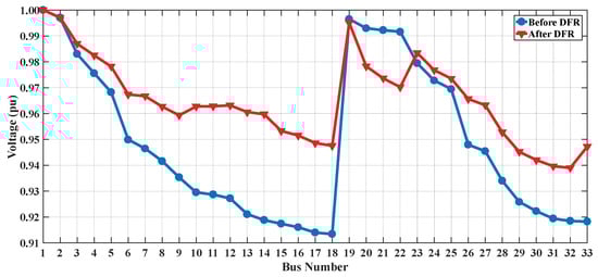 Voltage profile before and after reconfiguration of IEEE 33-bus system.