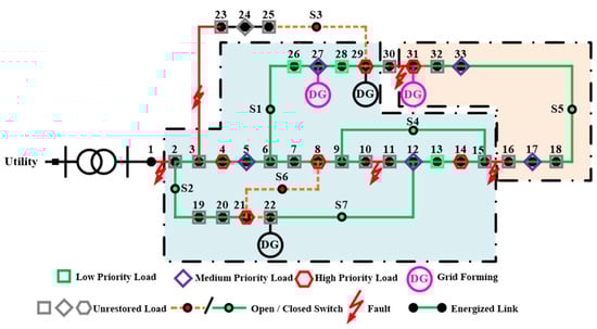 After validation of the model for handling the ACOPF problem in the presence of multiple resources in the distribution network, considering the reconfiguration possibility and maintaining the radiality of the network, the presented model is investigated by HILP events to show the functionality of the model in the optimal management of the network. In this regard, multiple disaster events resulting in several feeder outages have been examined. It is supposed that the links 1–2, 3–23, 10–11, 15–16, and 30–31 are out of service. As branch 1–2 is out of service, there is no possibility to feed the demands by the utility. In this case, without the DGs, there is no possible way to serve the loads, but even by considering DGs, the installed capacity is not enough to fulfil the overall loads. Therefore, the EMS should manage the load-serving possibility to maintain high priority loads as much as possible. In addition, by optimal switching actions in the presence of grid-forming units, the EMS can impose intentional islands in the reconfigurable network. It should be noticed that the amount of high, medium, and low priority loads are 800 kW, 720 kW, and 2195 kW, respectively [].