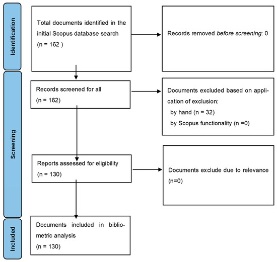 The document identification and screening approach was executed in compliance with the PRISMA 2020 principles to guarantee methodological rigor, replicability, and transparency. PRISMA, first designed for systematic reviews and meta-analyses, has progressively been used in bibliometric research to ensure procedural rigor and repeatability. PRISMA’s systematic methodology for establishing inclusion criteria, screening procedures, and final corpus selection has been corroborated in recent Scopus-based bibliometric studies across diverse fields, including microbiome-asthma research, greenwashing in finance, and the evolution of metaheuristic algorithms.