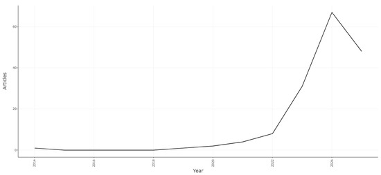 Annual scientific production (2014–2025) in ESG, green accounting, and urban sustainability research.