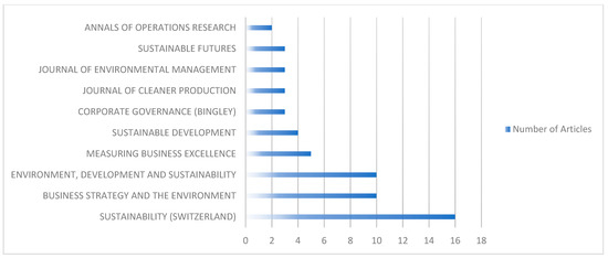 Business Strategy and the Environment, as well as Environment, Development and Sustainability, each include 10 articles that emphasize a robust focus on strategic environmental integration and sustainable development strategies within urban and organizational frameworks. These publications generally address issues related to the application of ESG frameworks, sustainability indicators, and the enduring socio-environmental consequences of corporate and policy choices, rendering them especially pertinent to the thematic focus of this study. Other significant sources are Measuring Business Excellence (5 publications), Sustainable Development (4), and Corporate Governance (Bingley) (3), all of which indicate an increasing interest in performance-oriented sustainability assessment, accountability, and governance structures. The Journal of Cleaner Production, Journal of Environmental Management, and Sustainable Futures—each featuring three contributions—illustrate the significance of this research area within environmentally oriented applied sciences, especially regarding the implementation of sustainability in urban systems and institutions.