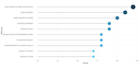 Figure 4 illustrates the distribution of institutional connections, highlighting the global academic scope of research in ESG, green accounting, and sustainable urbanization. The China University of Mining and Technology tops the field with 12 publications, closely followed by Jiangsu University with 11 and the Federal University of Paraíba with 10, reflecting robust participation from both Asian and Latin American academic communities. Universitas Diponegoro and the University of Delhi, each providing nine documents, underscore the significance of rising economies in influencing sustainability discourse. Moreover, research institutions such as the National Institute for Environmental Studies and The Hashemite University enhance international academic engagement in the subject, frequently associating environmental governance with policy-driven urban resilience methods. This extensive institutional involvement highlights the geographical variety of research leadership, underscoring that ESG-driven urban governance is a globally pertinent topic bolstered by cross-regional knowledge generation.