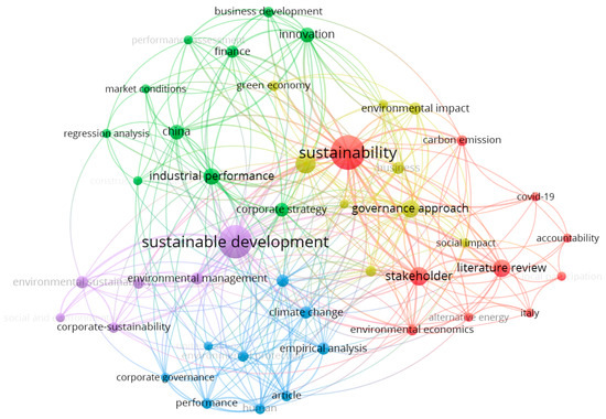 Based on a minimum threshold of three keyword occurrences across the bibliometric dataset, the co-occurrence network of author keywords is depicted in Figure 5. This network was generated using VOSviewer (version 1.6.20). The intellectual structure of the literature intersecting ESG frameworks, green accounting, and sustainable urban governance is reflected in the resulting visualization, which reveals five distinct thematic clusters. The keyword “sustainability” is essential to the network, as it serves as a conceptual anchor that transcends disciplinary boundaries and connects various thematic areas.