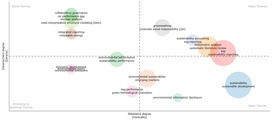 Furthermore, the thematic map developed by Biblioshiny (Figure 6) offers a structured perspective on the conceptual topography of the field by organizing themes based on their centrality (relevance to the field) and density (internal development). This strategic positioning underscores the fundamental, emergent, and specialized research areas in the context of sustainable urbanism, green accounting, and ESG strategies. The motor themes are conceptually central and well-developed domains, situated in the upper-right quadrant. Motor themes are those that are both mature and foundational to the research landscape, as evidenced by their high centrality (strong relevance to the discipline) and high density (internal development) in bibliometric mapping. In contrast, themes that are either emergent or declining (located in the lower-left quadrant) exhibit low centrality and low density, indicating that they are either nascent and underexplored or are losing relevance over time [15,31].