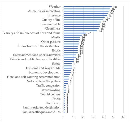 The breakdown of the attributes used in the different dimensions according to Beerli and Martin [45] shows that time comes first and can be seen in almost all photo posts. A similar thing happens with the visibility of influencers, who appear in almost every photo. In addition, the attributes of attractiveness, scenic beauty and quality of life of the respective destination are often found. In particular, relaxing and fun or pleasant can be found as atmospheric attributes. The lowest number of attributes is found in the tourist infrastructure, such as bars, discos and clubs, as well as in the general infrastructure (see Figure 1).
