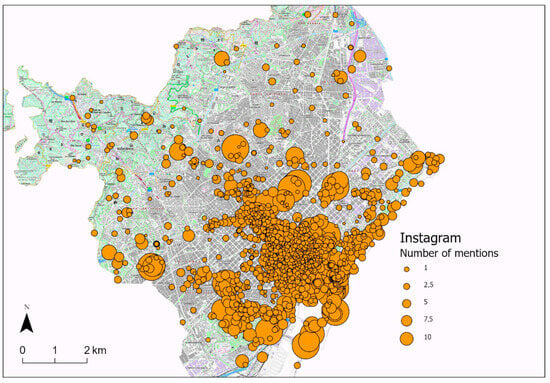 Our analysis employed traditional hexagonal tessellations [53]. Following García-Palomares et al. [54], we used hexagons with side-lengths of 200 m and ArcGIS Pro 3.2 software for making calculations. A side-length of 200 m is considered to provide an optimal balance between the spatial resolution necessary for detailed analysis of the study area and the overall readability and interpretability of the resulting map. The number of ‘likes’ served as the weight variable for Instagram, whereas the number of mentions was used for ChatGPT in the hexagonal tessellations.