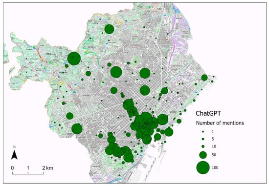 The 10,590 valid mentions found on Instagram (Figure 1) were compared with the 9834 obtained from ChatGPT (Figure 2). This showed a significant difference in the number of locations identified: 1321 on Instagram as opposed to 215 on ChatGPT—six times fewer. Both sources highlighted a significant number of locations in the historic center of Barcelona and in the southern part of the city (the park and the museum area of Montjuïc). However, the Instagram distribution was clearly more extensive and also included attractions located on the outskirts of the city and on the coast (to the east).