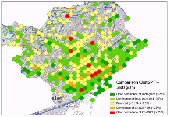 The concentration of ChatGPT images could be seen more clearly when we compared the results presented using hexagons (Figure 3). Of the 326 hexagons containing images derived from either Instagram or ChatGPT data, it was only possible to observe a balanced distribution (deviation of +/− 10% of the weight) in 114 (35.0%). In nine hexagons (2.7%), the ChatGPT images showed a significantly greater presence than those from Instagram (+25% mentions). In another 12 hexagons (3.7%), ChatGPT revealed a slightly higher presence than Instagram. In contrast, in 152 hexagons (46.6%), Instagram exhibited the greatest presence, while in 39 (12.0%) it showed a clear majority presence.