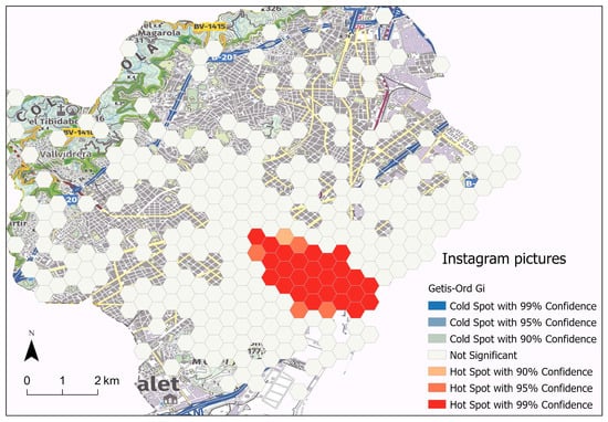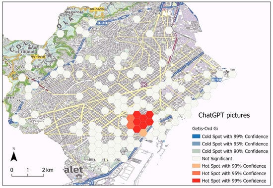 The first phenomenon to consider was that no cold spots were detected for either our Instagram (Figure 4) or ChatGPT (Figure 5) data. There were, therefore, no areas of the city in which clearly lower presences of Instagram or ChatGPT images were detected with respect to the average value.
