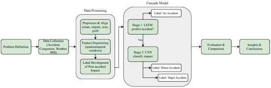 To provide a clear overview of our study design, Figure 1 presents the research workflow. The process begins with the collection and integration of four real-world datasets, followed by data preprocessing, feature engineering, and the construction of a novel post-accident impact label. The processed data is then passed through a two-stage cascade model: first, an LSTM predicts the likelihood of an accident; if an accident is detected, a CNN subsequently classifies its impact severity. The workflow concludes with model evaluation and comparison, followed by discussion of key insights and practical implications.