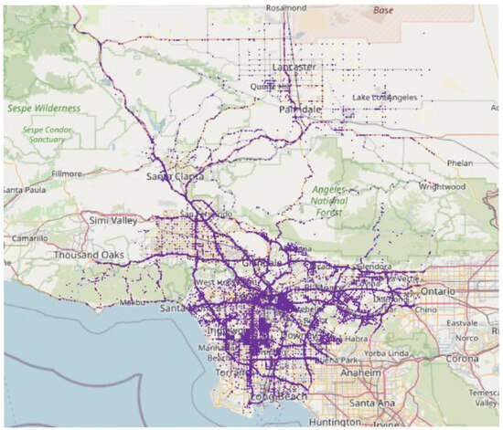 This study adopts the US-Accident dataset, a large-scale traffic accident dataset compiling data collected from all over the United States [43] between 2016 and 2020. This dataset contains accident events collected from two sources, MapQuest Traffic and Microsoft BingMaps, and it covers 49 states of the United States. A total of 73,553 accident records were extracted that cover four years from August 2016 to December 2020. Figure 2 shows the dispersion of accident location in the area of study that covers both freeway and urban arterial roads. Features of reported accidents are listed in Table 3. The reader can find a detailed description of features at smoosavi.org/datasets/us_accidents (accessed on 3 June 2025).