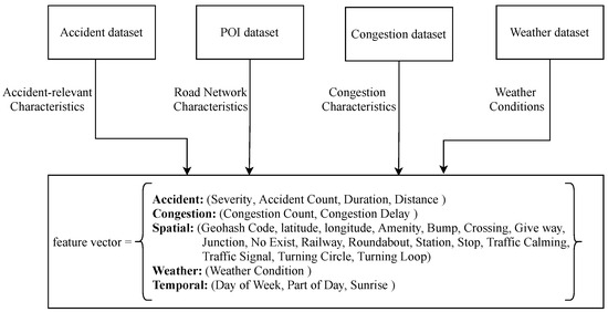 The initial accident dataset includes a variety of features. However, we only use highly accident-relevant features, and further augment the data with additional features described in Section 3.1 to create the input feature vector. Road-network characteristics of regions are added to differentiate between various types of urban and suburban regions, congestion-related information is added to empower the model in finding latent patterns between accident and congestion events, and weather data collected from the nearest airport based on accident’s occurrence time and location is used to further help the model by encoding weather condition data. Figure 3 summarizes how the input feature vector is built in this study.