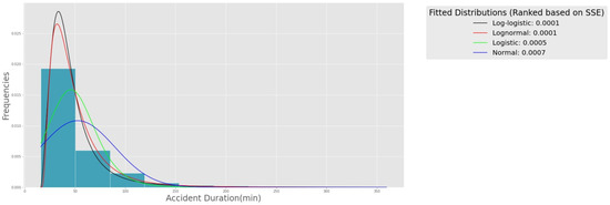 The sum of the squared estimate of errors (SSE) calculated for four selected distributions is shown in Figure 4. Log-normal and log-logistic distributions have the lowest SSE and therefore describe accident duration data the best. This is aligned with findings reported by Zhang et al. [2]. They used the AIC (Akaike Information Criterion) and the BIC (Bayesian Information Criterion). They found log-normal and log-logistic distributions to be the first and the second best-fitted distributions, respectively.