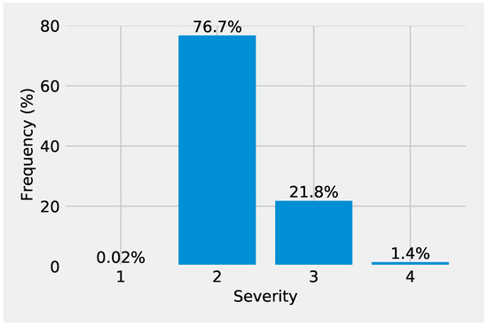 - Severity: This is a categorical attribute that shows severity in terms of delay in free-flow traffic due to accidents. It is defined by the original data providers based on real-time traffic conditions and reports, where 1 indicates minimal disruption and 4 indicates significant traffic delays. Although it seems to be a highly relevant feature, it suffers from skewness when looking at its distribution (see Figure 5), and is a coarse-grained factor (i.e., it is represented by just a few categorical values).