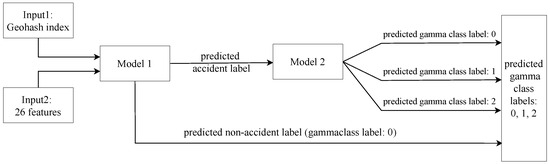 LSTM and CNN models are sequentially combined in terms of a “cascade” model. We specifically chose these two models because of their ability to handle temporal dependencies effectively. Furthermore, their combination offers a stronger capability to distinguish between accident and non-accident events, especially in imbalanced datasets, compared to using each model individually. Our model performs better in discriminating high-impact accidents. It achieves this by first distinguishing between accident and non-accident events and subsequently predicting the post-accident impact of the accident events. In more detail, the cascade model utilizes a sequence of the last T time intervals (e.g., a two-hour interval) within each specific region (e.g., a zone specified by a square of size 5 km × 5 km on map) to predict the probability of an accident and its post-impact in that region for the next time interval (i.e., ).