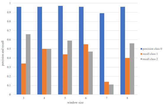 Comparison of evaluation metrics (i.e., recall for classes 1 and 2 and precision for class 0) based on the cascade model for different choices of input length (or window size).