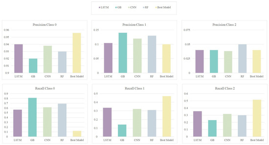 Comparing different models based on precision and recall to predict gammaclasses 0, 1, and 2.